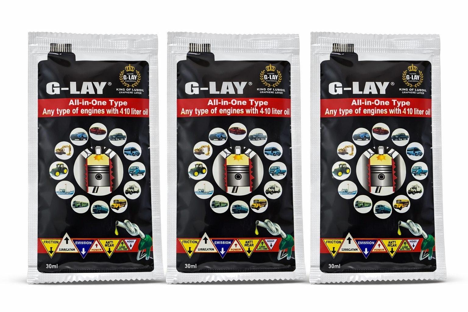 Suitable for any type of engine with 4-10 liter oil capacity. Two 30 ml sachets are needed for any type of big engine with 25 liter oil capacity.